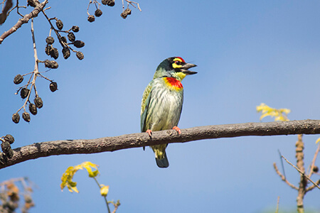 The pied falconet ranges from north-eastern India to east China and south-east Asia. They are found in deciduous forest edges and clearings in wooded foothills. This species likes clearing such as old cultivation lands with banks and stream. They are usually perched on tree tops while occasionally flying off to catch prey. These are not migratory birds, they are a resident species, staying in the same area for most of the year